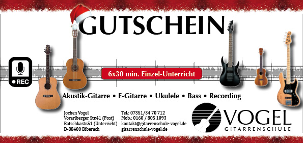Gutschein für Unterricht in Akustik-Gitarre, E-Gitarre, Ukulele, Bass oder Recording, gerne auch kombinierbar. Teilen Sie einfach Ihre gewünschte Menge, z.B. 6x30min., mit und erhalten den Gutschein frei per Post oder bei direkter Abholung.