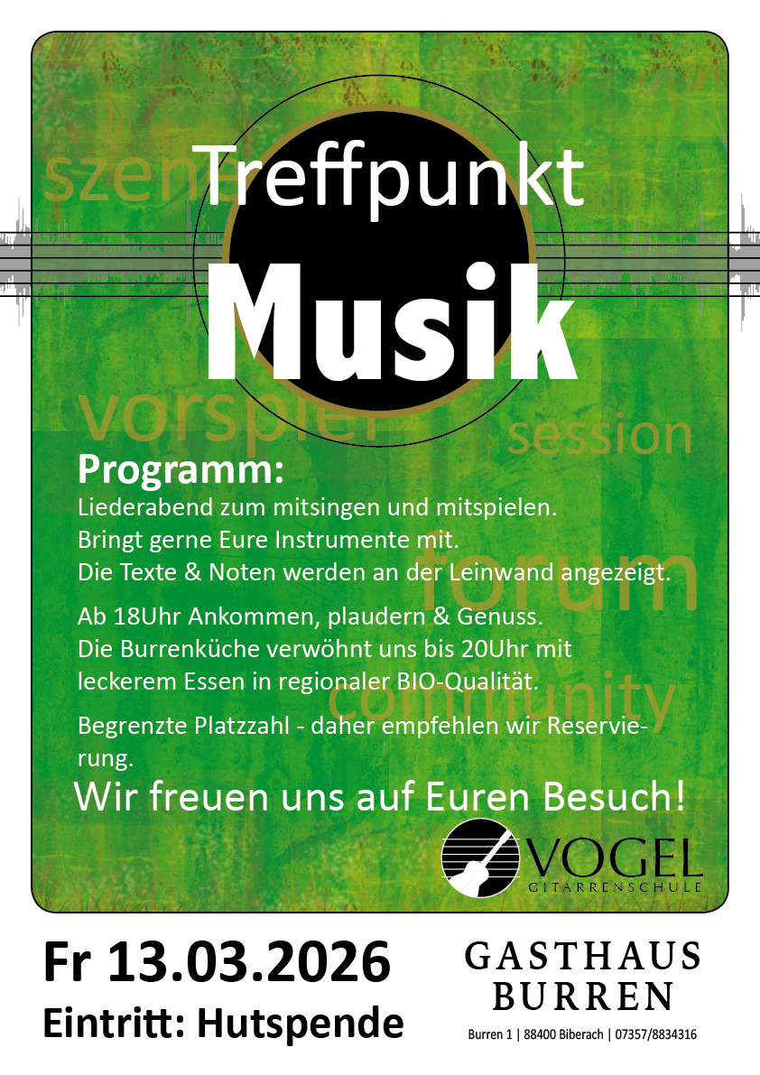 Konzert-Gitarre, Western-Gitarre, E-Gitarre, Jazz-Gitarre, Ukulele, Guitalele, U-Bass, E-Bass, Gesang